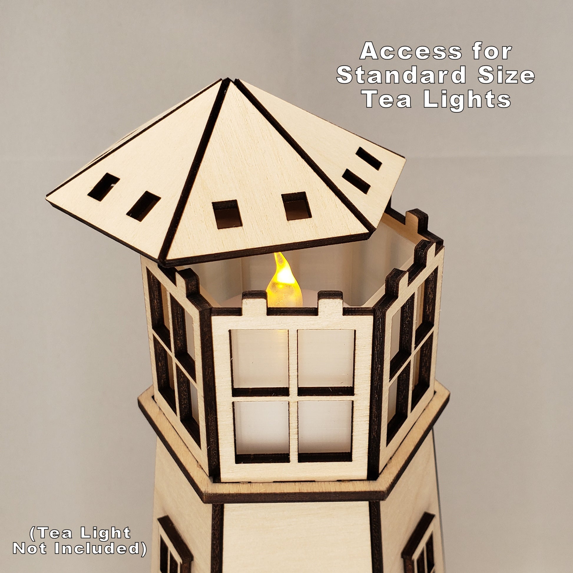 Removable Roof Top provides access for a Standard sized (1.4" Diameter) LED Flameless Tea Light (Not Included). Compartment will accommodate lights up to 1 5/8" in diameter (42mm). Model has a natural sanded wood finish, ready for display or for additional staining/painting/finishing.